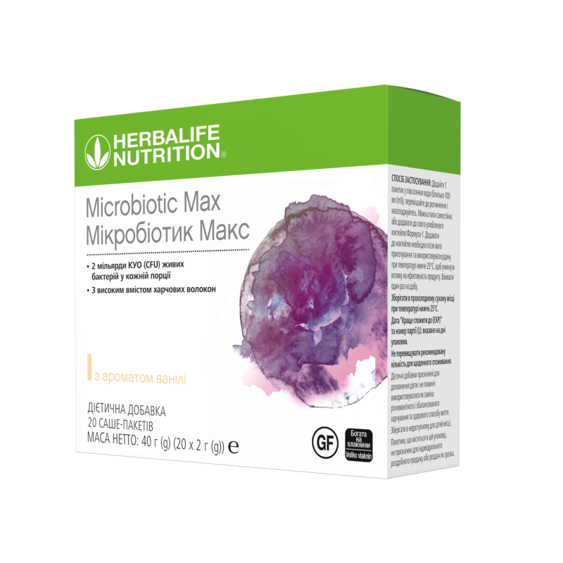 Мікробіотик Макс доступний у коробці з 20 саше, що робить його ще доступнішим для підтримки ваших цілей харчування, де б ви не були.